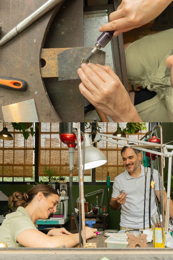 Trabajamos desde la fundición del metal todo el proceso hasta tener los anillos terminados. Todo con tus propias manos, yo solo voy a ir guiandolos en el camino.
